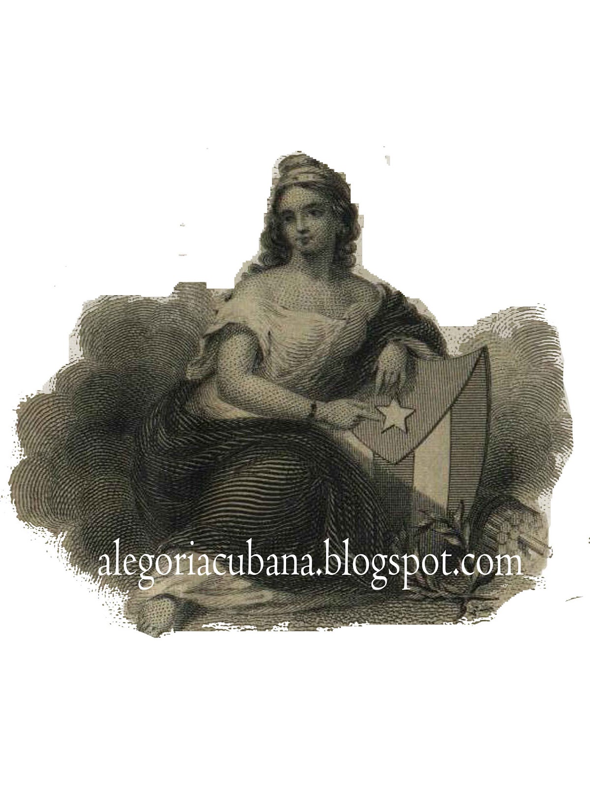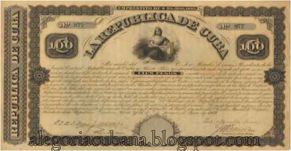 Esta imagen constituye una de las primeras alegorías definitivas y categóricas de nuestra nación. En 1869, la Junta Central Republicana de Cuba y Puerto Rico, con sede en NuevaYork, emite billetes dirigidos principalmente a los cubanos emigrados y comprometidos con la lucha, residentes en los Estados Unidos. En el billete de mil pesos, en la parte superior, justo debajo del nombre de la República, se encuentra una alegoría de la misma.